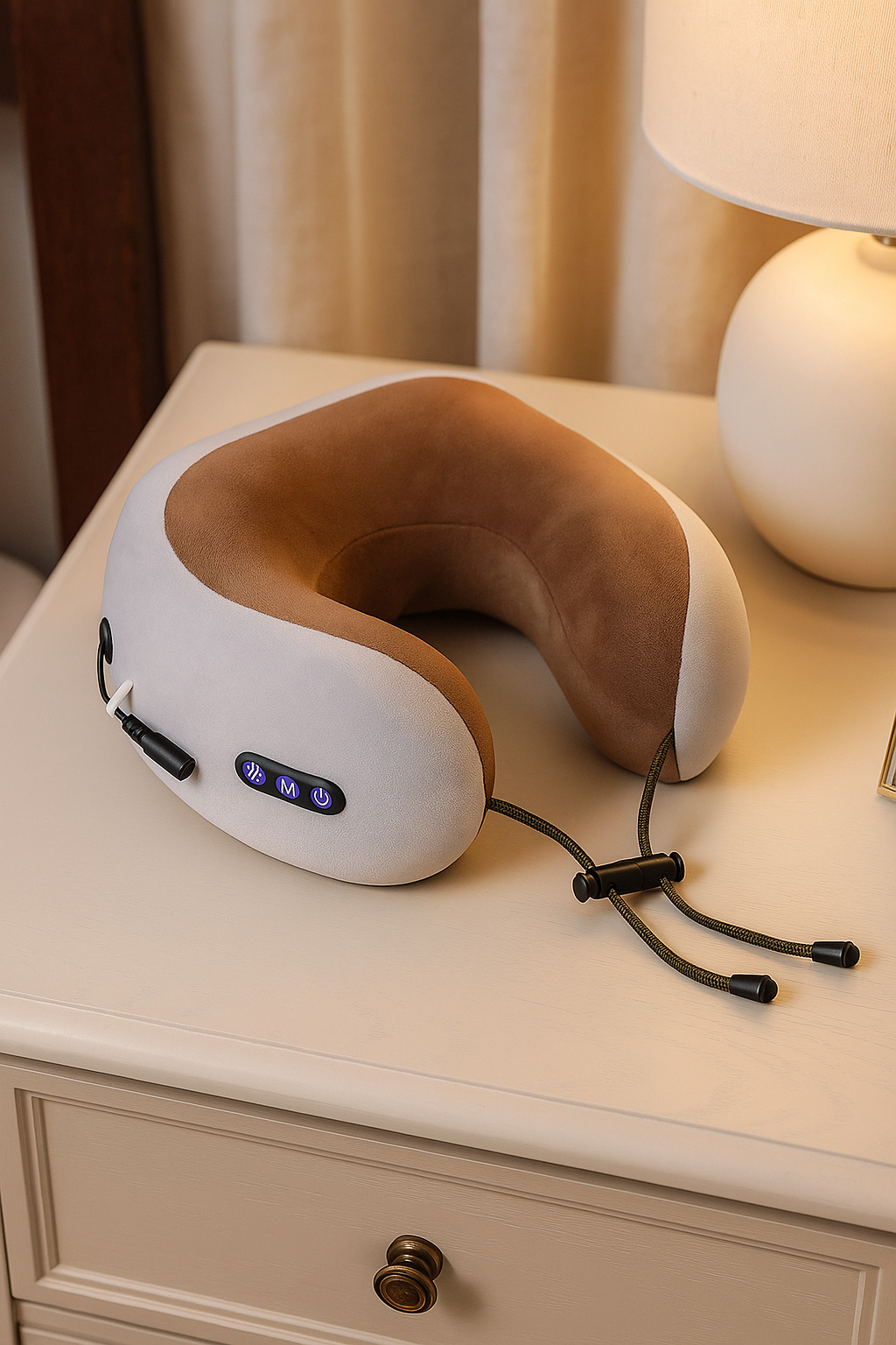 Projetada em formato U ergonômico, ela envolve suavemente o pescoço, proporcionando massagens vibratórias relaxantes que aliviam dores musculares e melhoram a circulação.